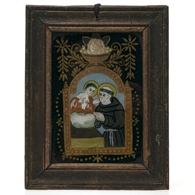 Sandl/Buchers, 1. Hälfte 19. Jh. Hl. Antonius mit dem Jesuskind im Rundbogenrahmen mit Golddekor. Alterungsspuren, min. rest. 18 x 12,5 cm.