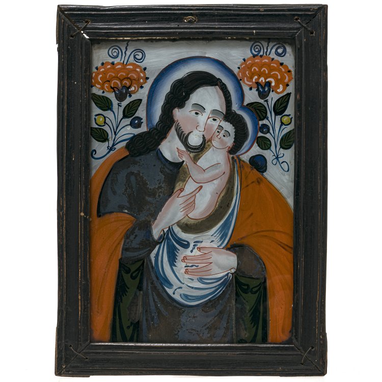 Sandl/Buchers, um 1850. Hl. Josef mit dem Jesuskind. Tempera/Glas. Farbablösungen. 29 x 19 cm.