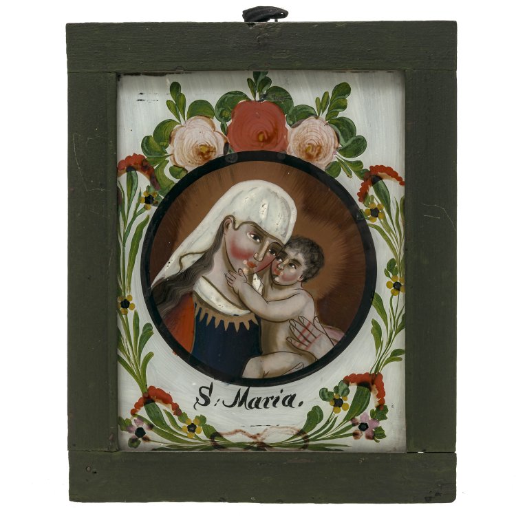 Oberammergau, 19. Jh. Maria mt dem Jesuskind. Tempera/Glas. Glas mit leichter Kratzspur. 22,5 x 17 cm.