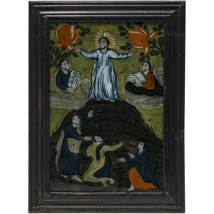 Verklärung am Berg Tabor (Jesus zwischen Moses und Elias, am Fuß des Berges Petrus, Johannes und Jakobus. Tempera/Glas. Rest. 30 x 20 cm.