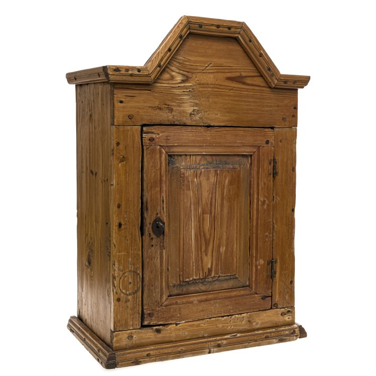• Kleines Wandkästchen (Schnapskästchen). Bayern, 19. Jh. Weichholz. 68,5 x 46 x 28 cm.
