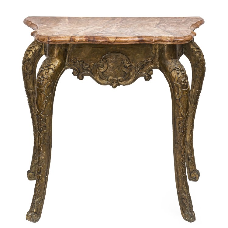 Ende 19. Jh. Barockstil. Goldfarben gefasst. Geschweifte Füße mit flach geschnitztem Bandelwerkdekor, marmorierte Deckplatte aus Holz erg. 79 x 80 x 51 cm.