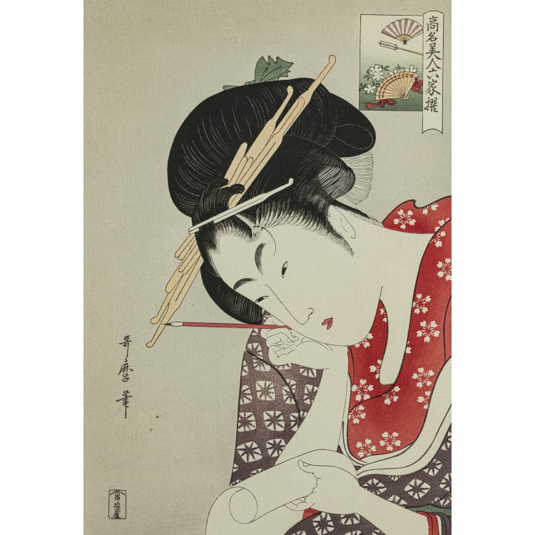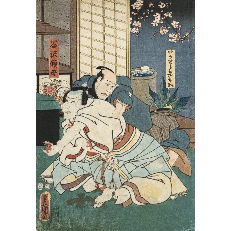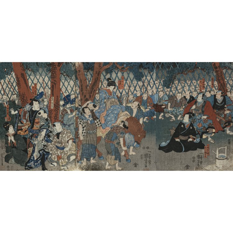 Japan, 20. Jh. Nachschnitt, Farbholzschnitt. Diverse Künstler (u.a. Sharaku, Tōshūsai, Yoshitoshi, Tsukioka, Kunisada, Kuniyoshi, Utagawa) und unterschiedliche Darstellungen: u.a. "Ōtani Oniji III. in der Rolle des Dieners Edobei", "Samuraikämpfer", "Szene aus dem Thetare Kabuki", "Komei bijin rokkasen" (Berühmte Schönheiten im Zusammenhang mit den sechs Unsterblichen). Unterschiedl. Größen. Alterungsspuren, teilw. leichte Knicke im Papier.