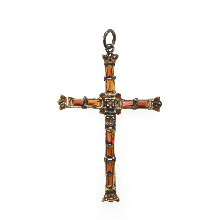 Silber, vergoldet, geschliffener, bernsteinfarbener Granatbesatz, geschliffen. L. 4,5 cm. Dazu kleiner Rahmen.
