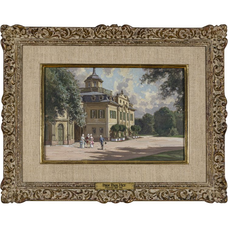 Höfische Gesellschaft im Schlossgarten an einem Sommertag. Gouache/Papier. 19,5 x 29 cm. Sign. Gerahmt und hinter Glas.