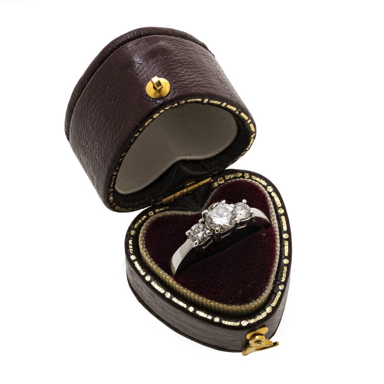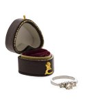 18 K WG (gestempelt). In die Schiene integrierter Brillantbesatz in Krappenfassung (0,5 und 2 x 0,20 ct). Ringgröße 56.