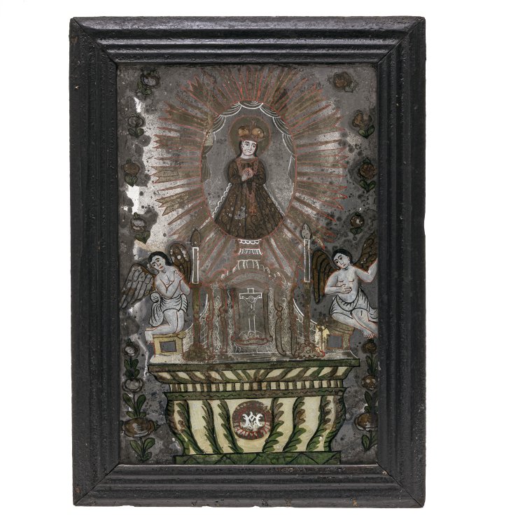 Bayern oder Böhmen, um 1800. Altar mit Tabernakel und Gnadenbild des gekrönten Jesuskindes im Strahlenkranz, von Engeln flankiert. Tempera/Glas. Alterungsspuren. 47 x 29,5 cm.