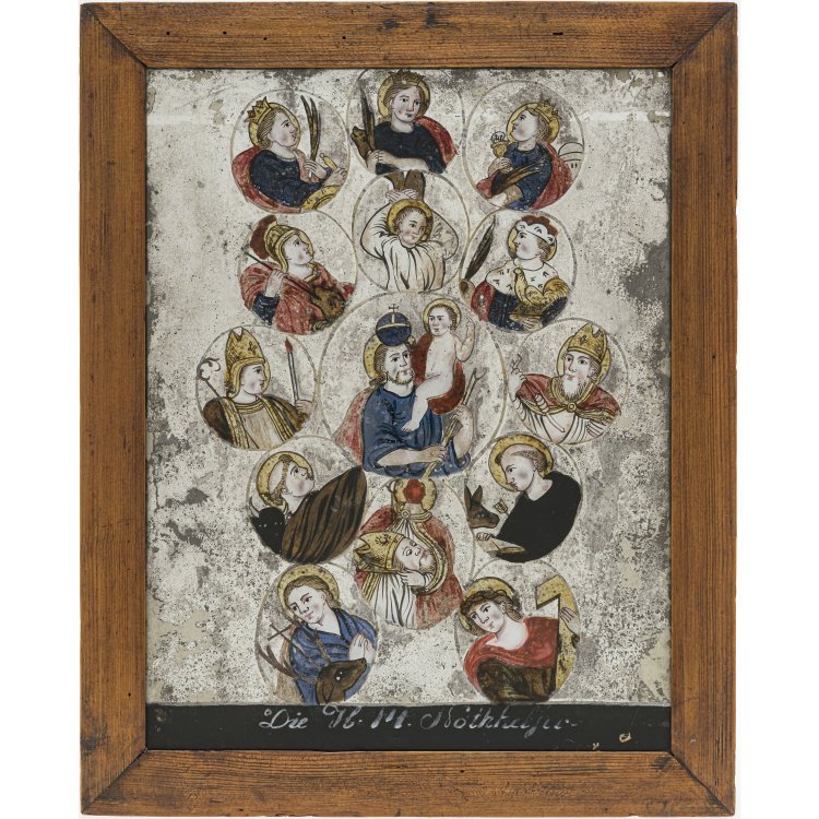 Schlesien, 19. Jh. Die hl. vierzehn Nothelfer. Tempera/Spiegelglas. 35 x 27 cm. Alterungsspuren.