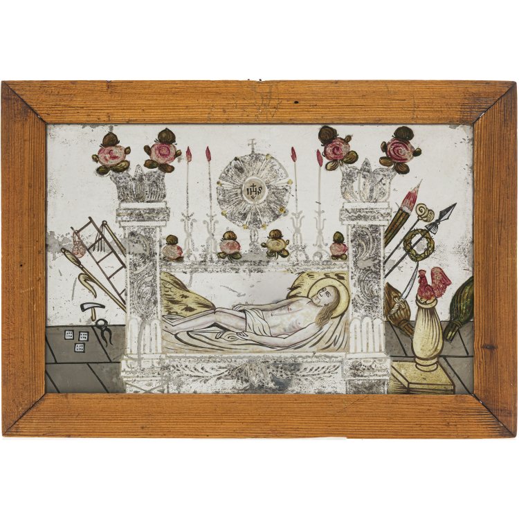 Familie Becker, Kaiserswalde, Grafschaft Glatz, 2. Hälfte 19. Jh. Grab Christi.Tempera/Spiegelglas. 17 x 27 cm.