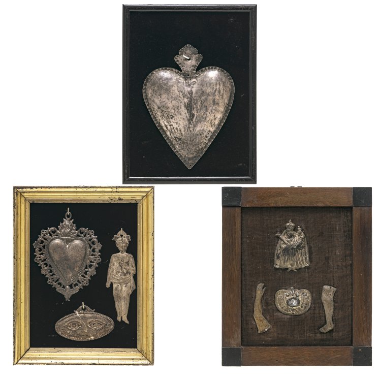 • Süddt., 19. Jh. Acht Votivgaben, u.a. flammendes Herz, Bein und Arm. Metall, versilbert. Diverse Größen. Gebrauchsspuren. Gerahmt.