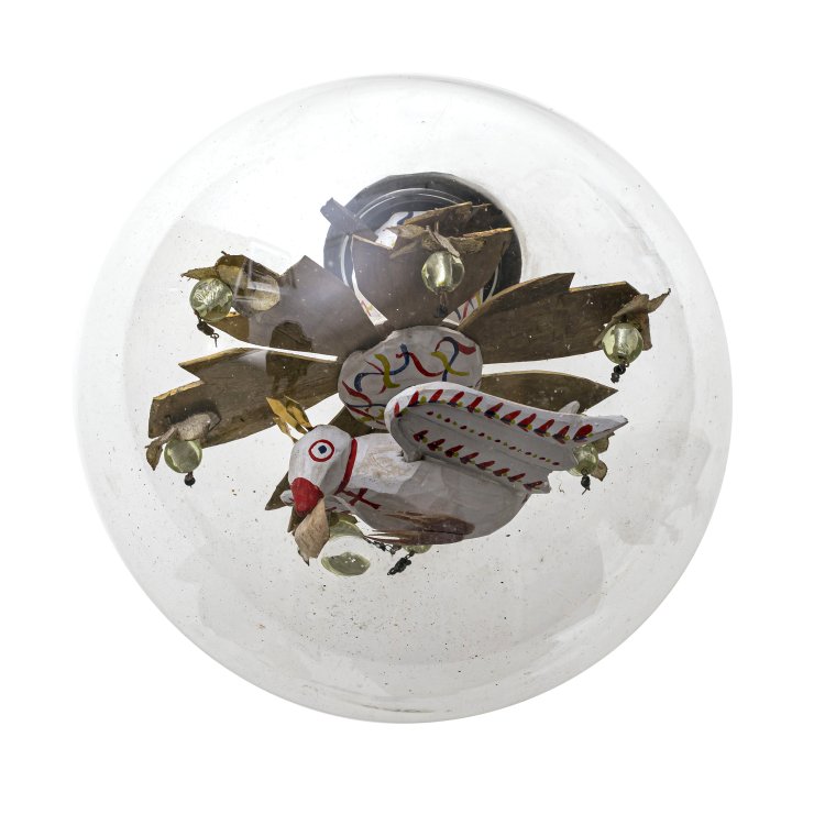 Bayerischer Wald. Farbloses Glas, Eingericht aus Schnitzarbeit Heiliggeisttaube mit Strahlenkranz, farbig bemalt. H. ca. 22 cm.