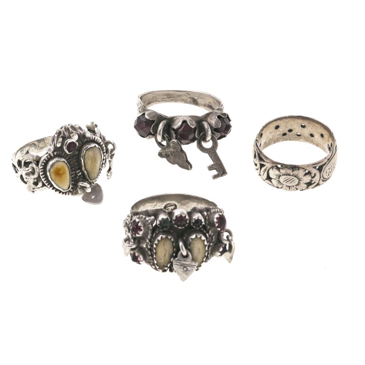 Süddeutsch. Hochzeits- bzw. Verlobungsringe. 1) Mit rotem Glasstein-, Grandelbesatz und anhängendem Schloss mit zwei Schlüsseln, Silber, gestempelt, 2) mit Grandel- und winzigem Glassteinbesatz und anhängendes Schloss mit zwei Schlüsseln, Silber (12 Lot, gestempelt), 3) Ring mit drei roten Glassteinen und zwei Anhängern, 4) Bandring mit graviertem Doppelherz und graviert "Glück". Verschiedene Ringgrößen.