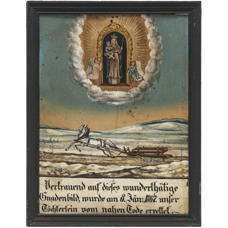 Süddt., dat. 1867. Anbetung des wundertätigen Gnadenbildes. Unfall mit Pferdeschlitten. Tempera/Metallblech. 32 x 24,5 cm.