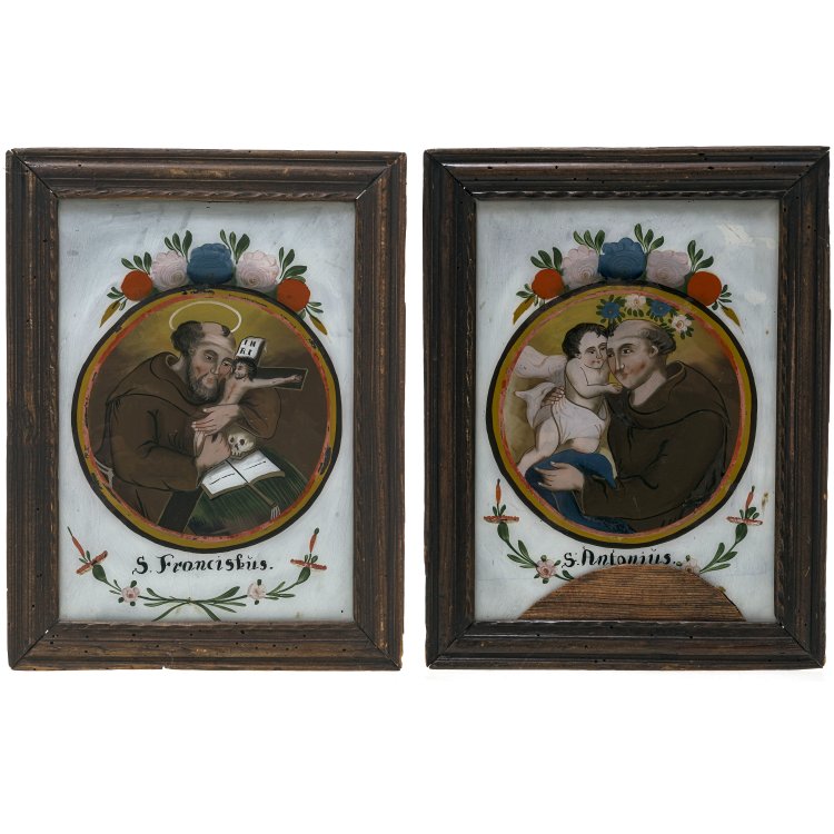 Seehausen, 19. Jh. Hl. Franziskus und hl. Antonius, jeweils in Rundkartusche mit Blüten. Tempera/Glas. Ein Glas besch., eine Rückwand erg. Je 24 x 17 cm.
