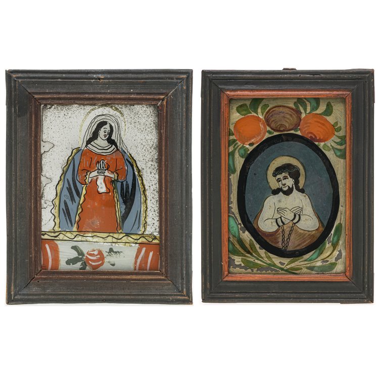 Maria bzw. Geißelungschristus. Tempera/Glas, eines mit partieller Silberbeschichtung. Besch. Je ca. 17 x 12 cm.