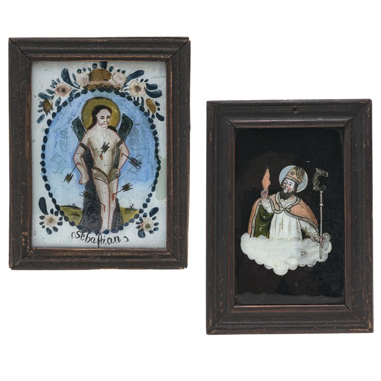 Süddeutsch. Hl. Sebastian in Ovalkartusche mit wenig Golddekor bzw. hl. Bischof auf Wolkenbank und schwarzem Grund. Tempera/Glas. Rest. Je ca. 18 x 12 cm.