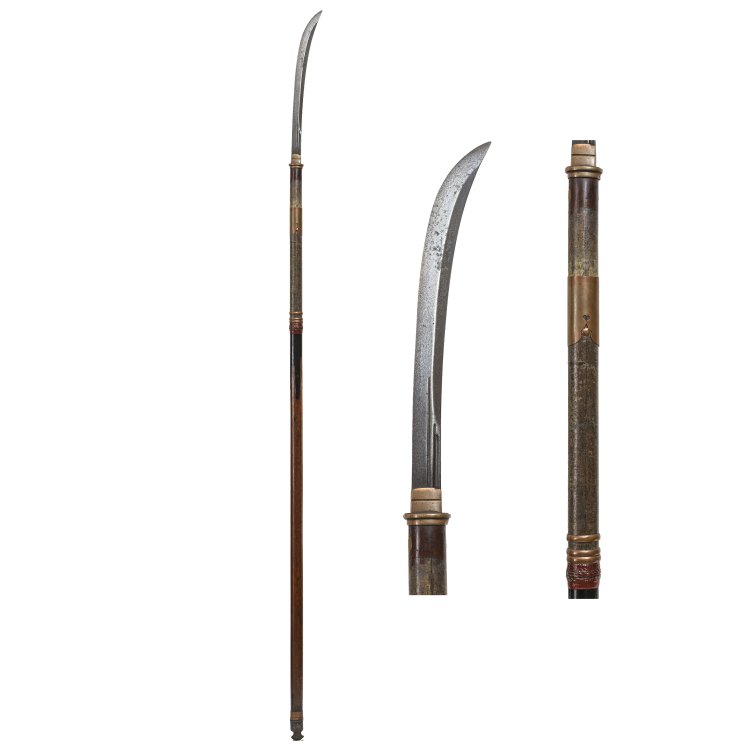 Gesamtlänge 195,5 cm. KLingenlänge 42,2 cm. Hibachi Kupfer. Nicht demontiert. Saya fehlt. Schönes dunkelbraunes Holz mit schwarzem Lack. Mittig rot eingefärbte Same.