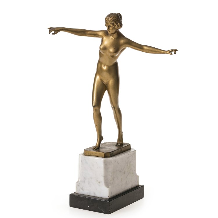 Jungte nackte Tänzerin. Bronze, feuervergoldet. Sign. Auf Marmorsockel montiert. H. Bronze ca. 22 cm, Sockel ca. 8,5 cm. Abrieb, minim. best.