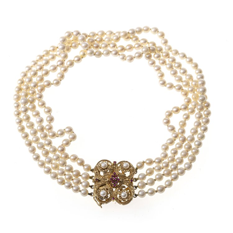 Zuchtperlen (Salzwasser), ø 5,0-5,5 mm, dekorative, floraler Zierschließe GG (14 K) mit vier Zuchtperlen (ø 4 mm) und 13 facettierten Rubinen (zus. ca. 0,32 ct). L. ca. 38 cm.