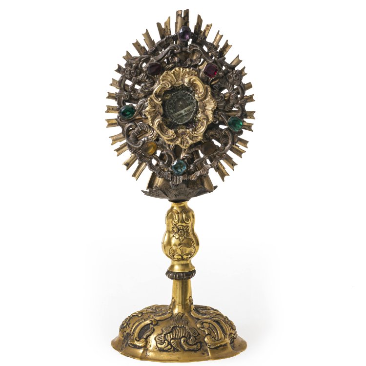 Süddeutsch. Metall, tw. versilbert, erneuerte Vergoldung. Rocailledekor mit farbigem Glassteinbesatz, Reliquienkapsel mit Siegel. Verändert. H. 24 cm.
