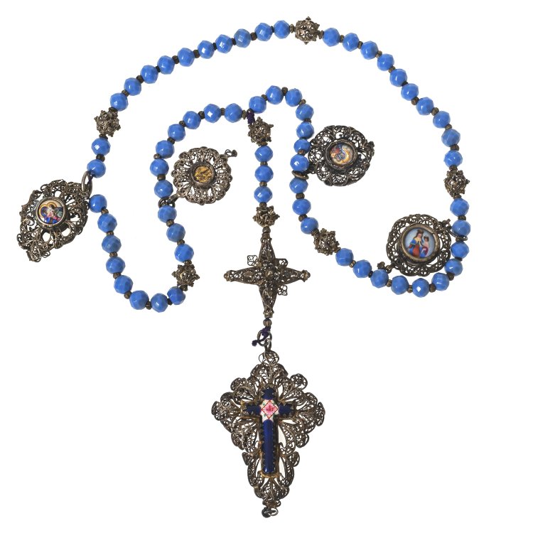 1. Jh. Sechs Gesätze. Perlen aus facettierten Glassteinen. Filigran gearbeitetes Metallkreuz mit Emaillebesatz, diverse Anhänger mit Emaillemedaillons. Gebrauchsspuren. L. 50 cm.