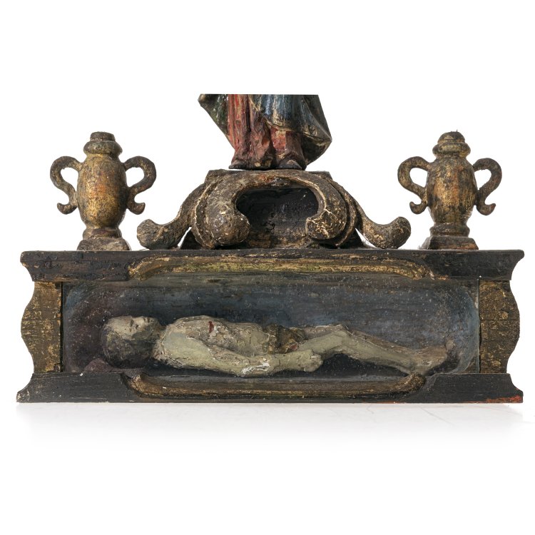 Alpenländisch, 18. Jh. Am Kreuzfuß Schmerzensmutter, von Altarvasen flankiert, im Sockel Grab Christi. Besch., Blumen der Altarvasen fehlen. H. 54 cm.