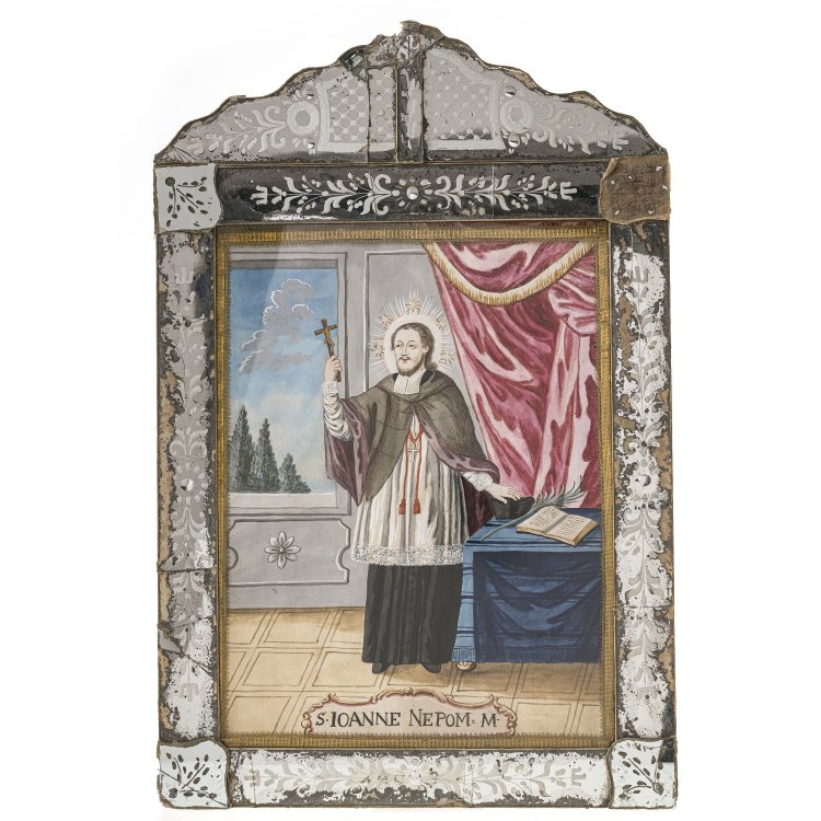 Süddt., 19. Jh. Darstellung des Heiligen Nepomuk mit Märtyrerpalme. Gouache/Papier. Rahmen mit geschliffenen Spiegelglasauflagen, besch. 34 x 25,5 cm Blattmaß 51 x 33,5 cm Rahmenaußenmaß.