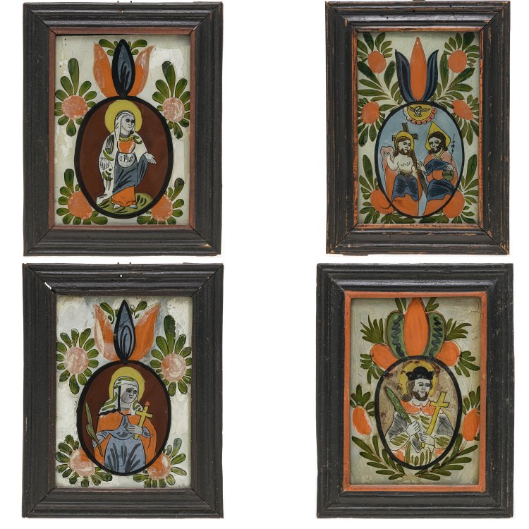 1. Jh. Heilige Dreifaltigkeit, hl. Johannes von Nepomuk, hl. Maria von Bogenberg und hl. Maria Magdalena, jeweils in Ovalkartusche. Tw. besch., rest. Eine Tafel rückseitig handschriftlich bez.: "Sammlung O. Söppel". Je ca. 18 x 12 cm.