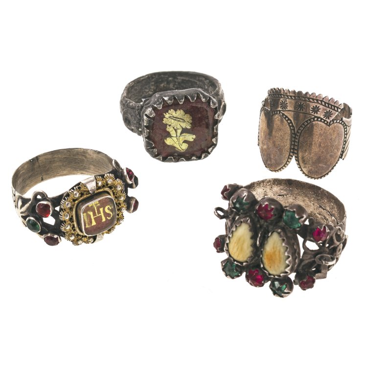 1. Zwei Ringe mit Goldeglomisé, einer davon mit Blütenmotiv, Metall, besch., der andere mit IHS-Monogramm, Silber (12 Lot, gestempelt, Schwäbisch Gmünd), 2) silberner Verlobungsring mit Krone, 3) Hochzeitsring mit farbigem Glasstein- und Grandelnbesatz und einem anhängenden Schlüssel, der andere fehlt, Silber (12 Lot gestempelt, Schwäbisch Gmünd). Verschiedene Ringgrößen.