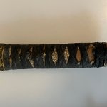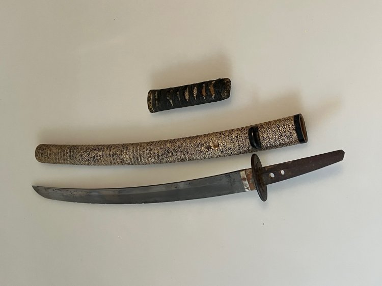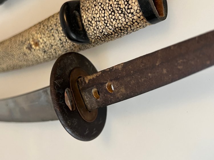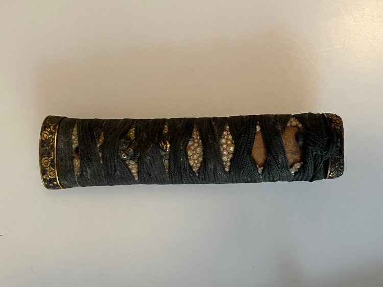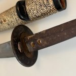 Japan. Japan. Saya mit kräftiger Same umwickelt und gerippt, best. Griff ebenso mit grober Same (besch), Seidenwicklung und je einem beidseitigem Menuki in der Darstellung einer Frucht. Fuchi / Kashira mit der Darstellung von Blüten. Ein Mekugi-ana, Angel unsign. Habachi Kupfer. L. 59 cm. Klinge 40 cm, mit starken Scharten. Tsuba in Eisen, mit der Darstellung von fliegenden Vögeln über einer Landschaft..