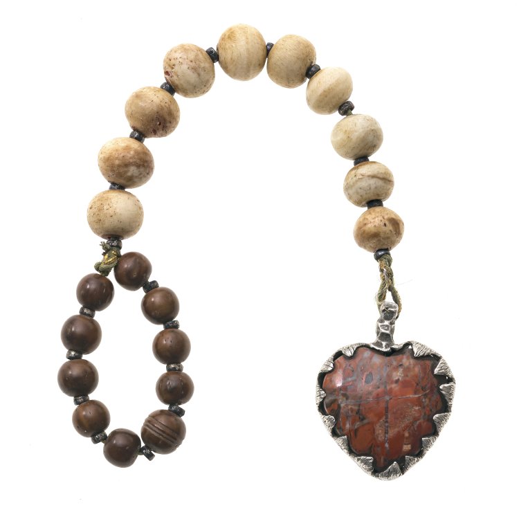 Süddeutsch. Perlen aus weißem Stein, Fingerkette aus Buchsbaumkugeln, herzförmiger, polierter Jaspisanhänger mit Zackenbandmanschette. L. 25 cm.