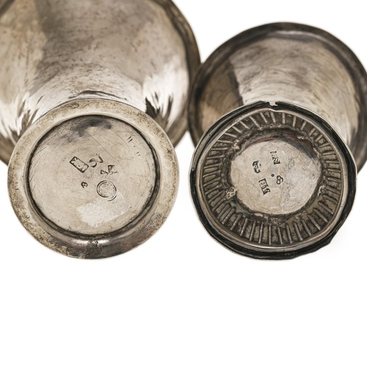 Schweden, einer mit MZ: "AB". Silber. Konisch auf erweitertem Stand, Wandung mit geflecheltem Dekor. Mehrfach best. Gemarkt. Ca. 70 g. H. 8-10 cm.
