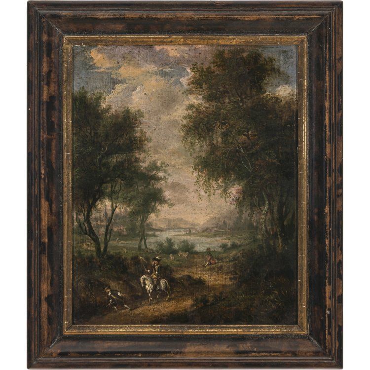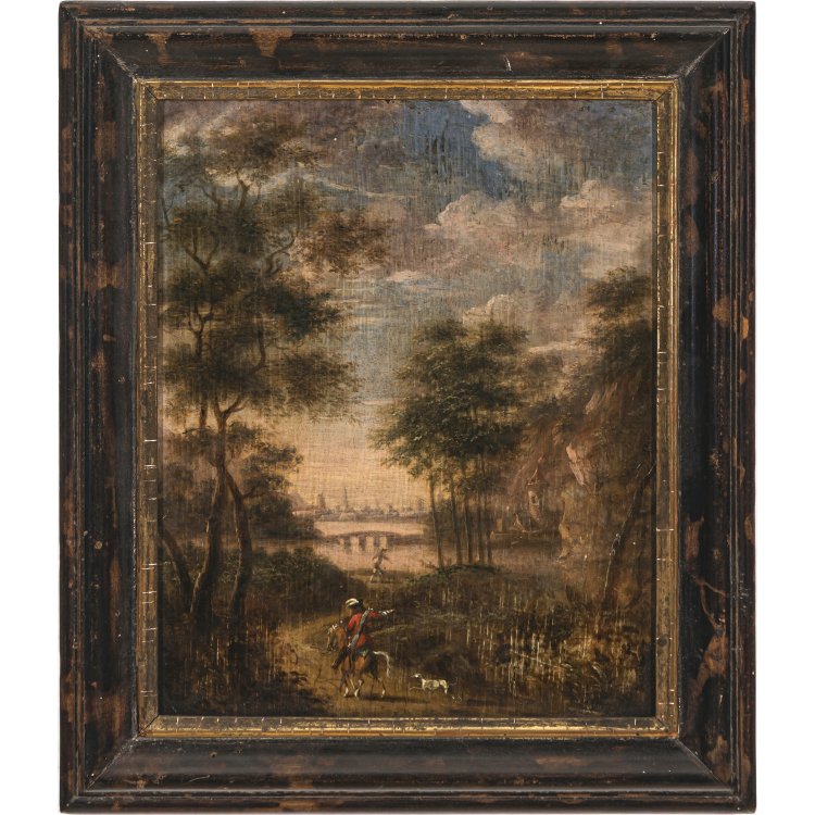 Zwei Gemälde: Flusslandschaften, im Vordergrund jeweils Reiter. Öl/Eiche. Je 19 x 15,5 cm. Leicht besch.