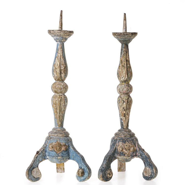Alpenländisch, 18. Jh. Weichholz, geschnitzt, Reste von Farbfassung. Schauseitig gearbeiteter Fuß auf zwei Voluten. Für eine Bauernstube. Besch. H. 35 cm.