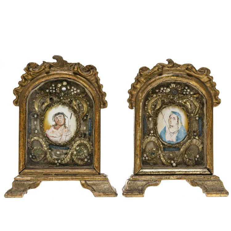 Schmerzhafte Muttergottes und Ecce Home. Aquarell/Papier, umgeben von Krülltechnik und Reliquien, Je ca. 22 x 17 cm.