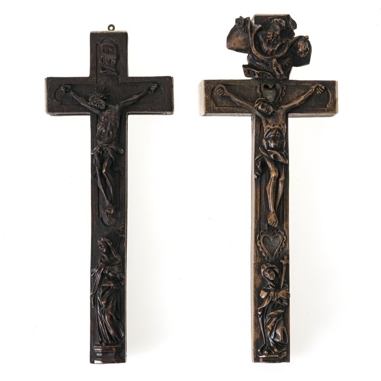Oberammergau, um 1800. Holz, geschnitzt, die Querbalken des Kreuzes mit Rinderhornbesatz. Vorderseitig mit Corpus Christi und Schmerzensmutter, eines zusätzlich mit Gottvater, rückseitig mit Schieber, einer mit Arma Christi in Flachschnitzarbeit, innen Drahtarbeit und Reliquienpartikel. Eines min. besch. L. 24,5-25,5 cm.