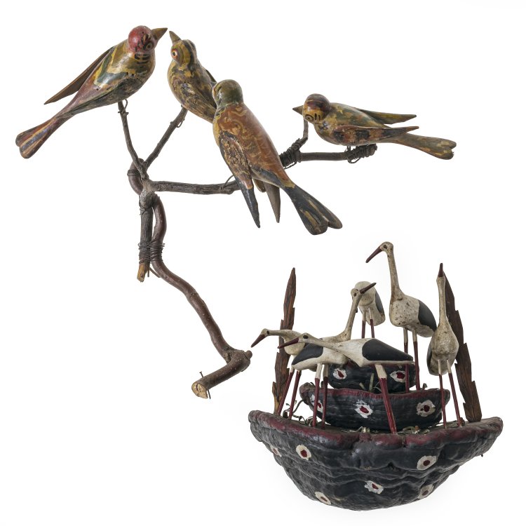 Alpenländisch, 19. Jh. Vier Vögel auf einem verzweigten Ast sitzend. Holz, farbig gefasst. Sechs Störche aus Holz, naturalistisch bemalt, auf einem Holzschwammsockel befestigt. Diverse Größen. Alterungsspuren, besch.