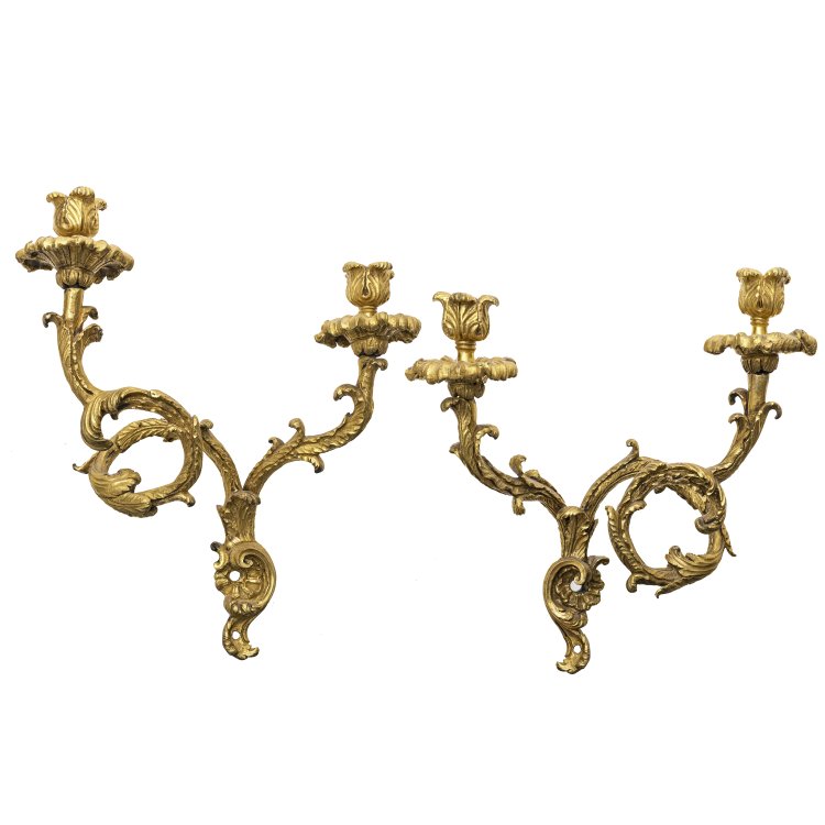 Frankreich, 19. Jh. Bronze, vergoldet, Oberfläche naturalistisch reliefiert und graviert. Gedrehte Blattarme, zweiflamig. Für Kerzen, nicht elektrifiziert. H. 34-37 cm.