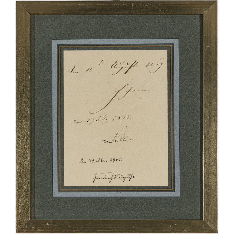 19./20. Jh. Blatt aus dem Gästebuch der Firma C. A. Preibisch (Textilunternehmen) in Reichenau, Sachsen. Mit den Original-Signaturen der Sächsischen Könige Johann (1854-1873), Albert (1873-1902) und Friedrich August III. (1904-1918). Ca. 20 x 14,5 cm. Gerahmt und in Passepartout.