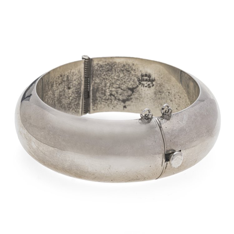 Mexiko. Silber. Hohl gearbeitet, oberseitig gewölbt. Öse des Sicherheitskettchens besch., leichte Tragespuren. Gemarkt. Ca. 60 g.