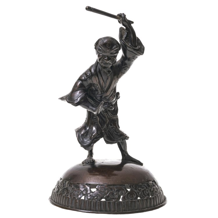 China. Aufsatz eines Deckelgefäßes aus Bronze. Flankiert mit einem Mann in kriegerischer Pose. H. 28 cm. Alterungspuren, Patina.