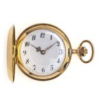 Schweiz, um 1900. 14 K GG (gestempelt), Oberfläche fein guillochiert, Cuvette Metall. Mechanisches Werk mit Handaufzug. Emailzifferblatt mit römischen Ziffern. Min. best., nicht auf Gangbarkeit geprüft. Deckel innen mit Feingehaltsmarken sowie MZ: "AH", Gehäusenr. 155760. Ca. 20 g.