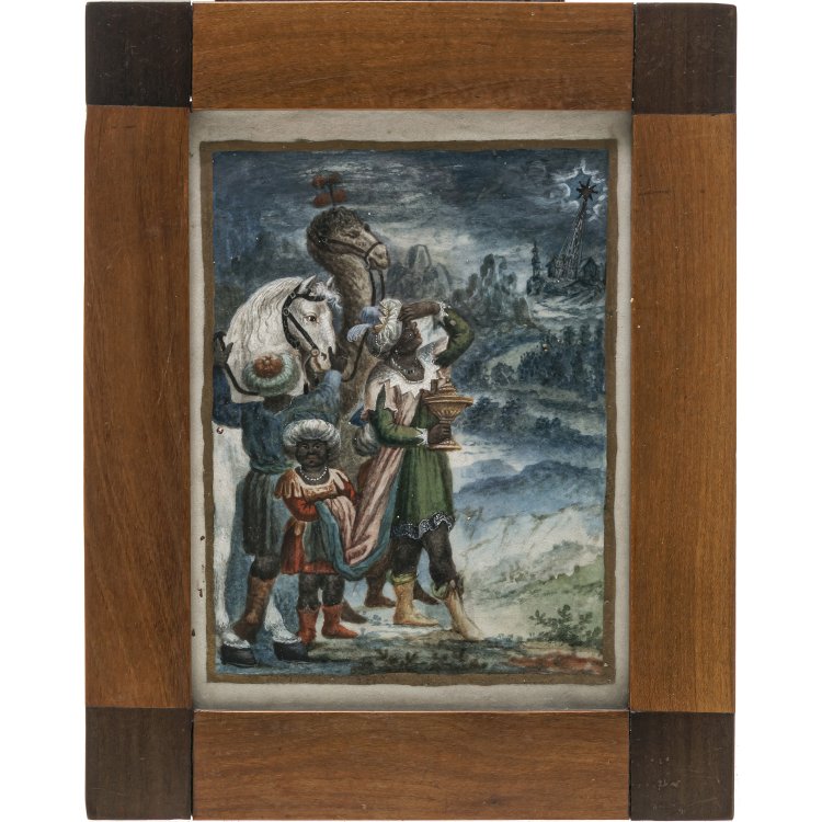Deutsch, 19. Jh. Darstellung des Heiligen König Balthasar mit Gefolge, den Stern zu Bethlehem erblickend. Aquarell. Ca. 12,5 x 9 cm. Minim. Alterungsspuren.