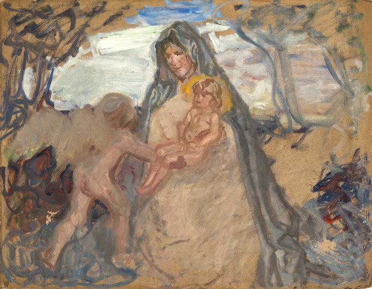 Muttergottes mit Kind und Engel. Öl/Karton. 57 x 73,5 cm. Unsign.