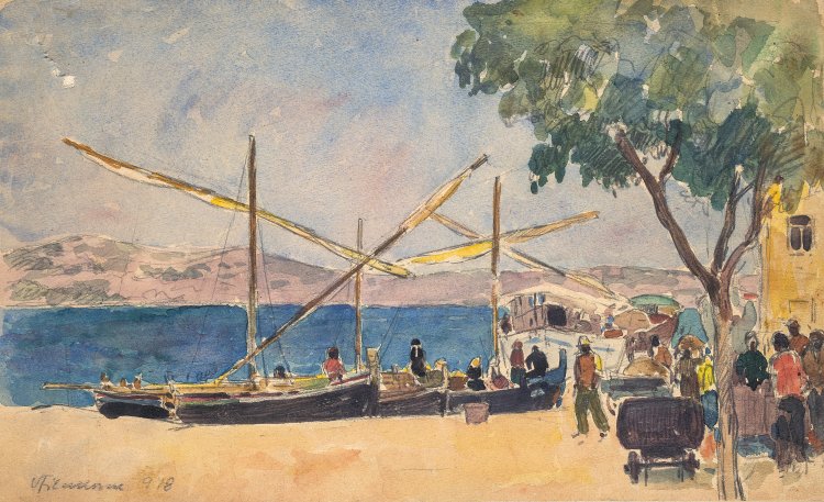 Südlicher Hafen. Aquarell. 22,5 x 36,7 cm. Min. gebräunt. Unleserlich sign., dat. 9/18.