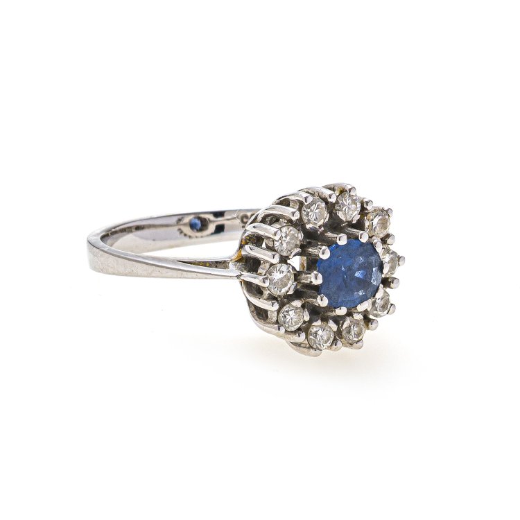 14 K WG. Blütenförmiger Ringkopf mit zentralem, rundem, facettiertem Saphir und Entourage aus 10 Diamanten (zus. ca. 0,50 ct), Krappenfassung. Ringgröße 49.