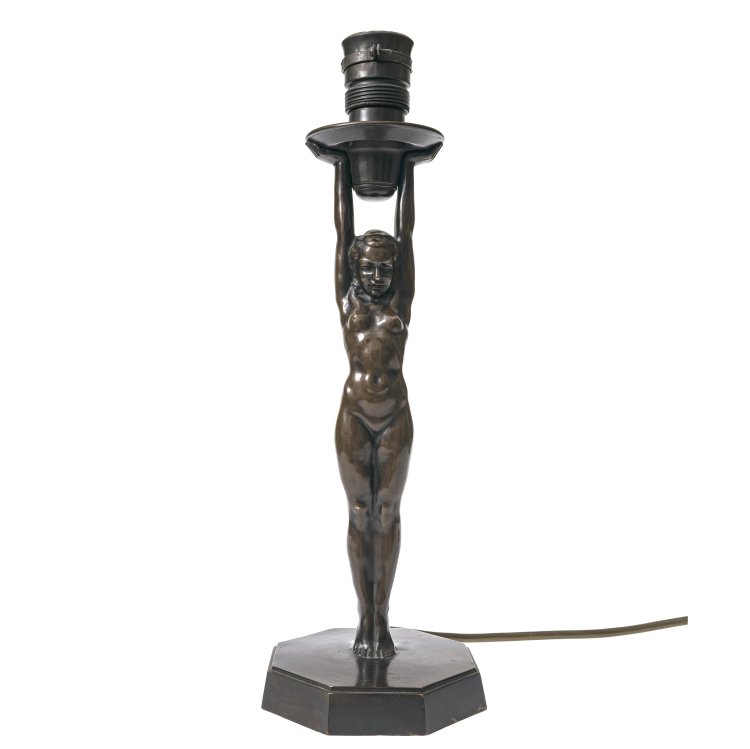 Stehender Frauenakt, eine Lampenfassung hochstemmend. Bronze, Patina. Vollrund ausgeführt, auf Plinthe sign. "A. Daumiller". Gesamthöhe mit Aufsatz 54,5 cm, Bronzefigur mit Gestell H. 38 cm. Als Lampe konfiguriert, Schirm fehlt. Elektrifiziert. Minim. Gebrauchsspuren.