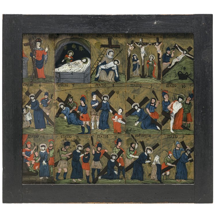 Anfang 19. Jh. Großes Hinterglasbild mit den vierzehn Kreuzwegstationen. In drei Reihen fünfzehn Felder, beginnend unten links mit der ersten Station, oben links im fünfzehnten Feld hl. Helena. Tempera/Glas. Glas mit Sprüngen, rest. 38 x 43 cm.