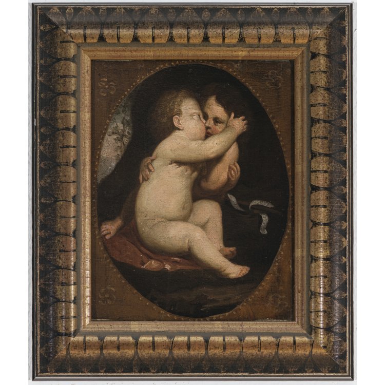 Jesus- und Johannesknabe in Umarmung. Öl/Lw. 27 x 20 cm. Rest., doubl. Unsign. Rückseitig bez.