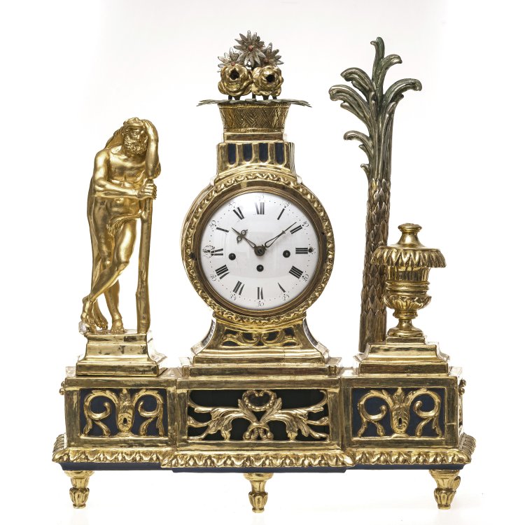 Süddeutschland/Österreich, um 1780. Holz, neu vergoldet. Herkules im Kontrapost. Exotische Palme und Blumenvase als Schmuckelemente. Ziffernblatt aus Emaille, besch. bei der "9".